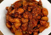 Свинина, нарезанная кубиками, маринованная в уксусе с чесноком, имбирем и специями, обжаренная в масле и тушенная в томатном соусе с картофелем.
