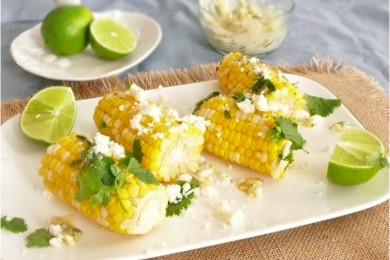 Кукуруза, приготовленная на гриле в фольге, смазанная маслом с зеленью и острым перцем и посыпанная острым мексиканским сыром.