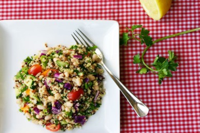 Полезная для здоровья киноа со свежими овощами и соусом из уксуса с лимоном и оливковым маслом.