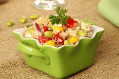 Вкусный и полезный салат из киноа, кукурузы, тыквенных семечек и красного перца, приправленный пряным соусом.