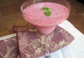 Холодный освежающий суп из ванильного йогурта с клубничным пюре, медом и молоком.