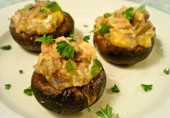 Грибные шляпки с начинкой из жареной панчетты (или другой разновидности бекона), мелко нарезанными ножками грибов, овощами и сыром, запеченные в духовке.
