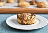 Булочки из миндальной муки с кокосовой стружкой, украшенные растопленным шоколадом.