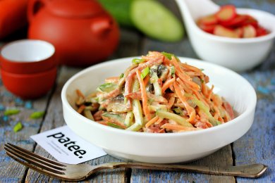 Готовим оригинальный салат с колбасой, свежим огурцом, жареными грибами и корейской морковью! Салат получается вкусным, и, что немаловажно, готовится очень быстро!