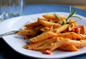 Паста и жареная колбаса индейки в сливочно-томатном соусе с луком, свежим розмарином и специями.