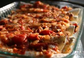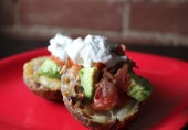 Лодочки из запеченного картофеля, начиненные говяжьим фаршем, с овощами, беконом и сыром.
