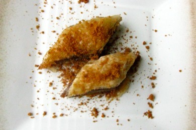 Пахлава из теста фило со спредом Бискофф и дробленым печеньем с пряностями, пропитанная сиропом из агавы.