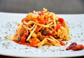 Спагетти в соусе с грибами и помидорами