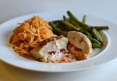 Куриные грудки, фаршированные козьим сыром с консервированным красным перцем, обжаренные на оливковом масле и доведенные до готовности в духовке.