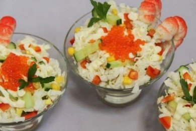 Салат из кальмаров с крабовыми палочками получается удивительно вкусным благодаря сочетанию этих двух продуктов.