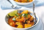 Карри с креветками, зеленым перцем чили, картофелем, базиликом и арахисом.