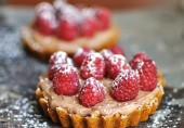 Мини-тарты из крошки печенья с темным шоколадом и свежей малиной.