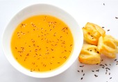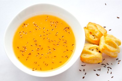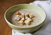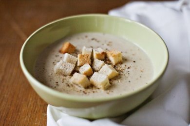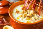 Невероятно вкусный и нежный суп, а для придания ему индивидуальности лучше всего подавать его с белыми сухариками и чипсами из бекона, сбрызнув ароматным чесночно-базиликовым оливковым маслом