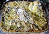 Запеканка из брокколи с грибами, сельдереем и плавленым сыром, посыпанная сухарями. Можно подавать с печеным картофелем или в качестве основного блюда.