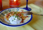 Сливочный суп-пюре с картофелем, луком и сливочным сыром, приготовленный в медленноварке. Подавайте с тертым сыром, обжаренным беконом, зеленым луком и сметаной.