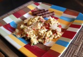 Мексиканский омлет Мегас с кукурузными лепешками, луком и томатами, и с миксом из мексиканских сыров.