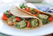 Кукурузные лепешки с креветками, капустой и красным перцем в йогуртовом соусе.