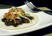 Куриные тако под соусом для барбекю, на кукурузных лепешках, с цитрусово-капустным салатом.