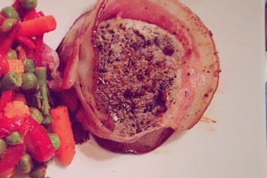 Медальоны из говядины, обернутые в бекон, с жаренными овощами.