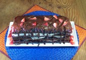 Банановый бундт-торт с клубничной начинкой, покрытый толстым слоем шоколадной глазури.