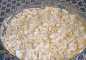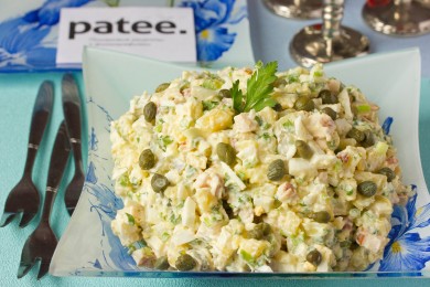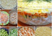 Готовим праздничный слоёный салат с копчёной курицей, картофелем, плавленым сыром и яйцами. Салат Невеста с копчёной курицей и яйцом выглядит весьма скромно и имеет простое оформление - завершающим слоем выступает слой из тёртых яичных белков, что олицетворяет собой белоснежный платье невесты.