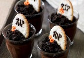 Еще одно угощение для ваших гостей в Хэллоуин - печенье в форме надгробий в шоколадно-сливочном креме, посыпанном вафельной крошкой.