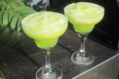 Сладкий освежающий коктейль из рома, дынного ликера Мидори, сока лайма и ананаса и сиропа с кубиками льда.
