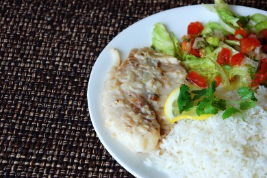 Филе тилапии, обжаренное на кокосовом масле и доведенная до готовности в кокосовом молоке с лимонным сорго.