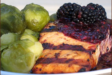 Филе лосося, покрытое чили-чесночным соусом и приготовленное на гриле. Подавайте с соусом из свежей ежевики с рисовым уксусом, медом, лимонным сорго и имбирем.
