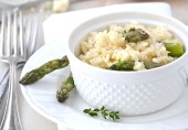 Сливочное ризотто с лимонным соком и приготовленной на пару спаржей.
