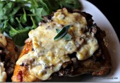 Куриные грудки, запеченные в духовке, с жареными грибами и луком, посыпанные тертым сыром.