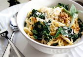Паста лингвини с тыквенным пюре, обжаренной с чесноком капустой кале, орехами и тертым пармезаном.