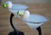 Ароматный японский коктейль Сакетини из сока личи с имбирем, соком лайма, водкой и саке.