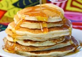 Блины на пахте и обезжиренном молоке с льняной мукой. Можно подавать с сиропом, фруктами, изюмом или орехами.