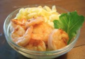 Салат из манго, заправленный чили-чесночным соусом с соком лайма и чесноком, и креветки, приготовленные на гриле или на сковороде.