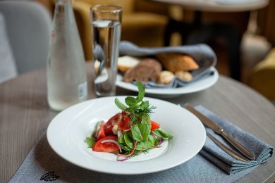 Салат из помидор с печенью трески с лимонным дресингом