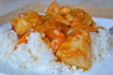 Куриное филе, обжаренное в масле с луком и чесноком и тушеное в соевом соусе с консервированными мандаринами.