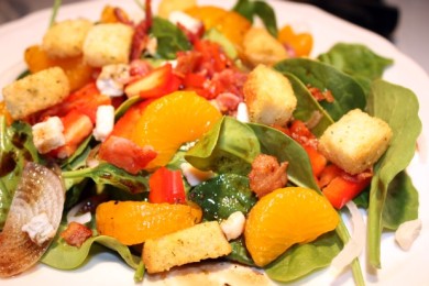 Легкий, освежающий салат с прекрасным ароматом, приготовленный из консервированных мандаринов, шпината, горгондзолы и бальзамического уксуса.