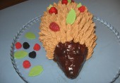 Порадуйте своих малышей, приготовив им ко дню рождения или другому празднику вот такой сюрприз - бисквитный торт в форме ежика с мордочкой, покрытой шоколадной глазурью, и иголками из шоколадного крема.