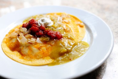 Пшеничные или кукурузные лепешки с жареной курицей, зеленым чили и специями, политые соусом, посыпанные тертым сыром и запеченные в духовке.