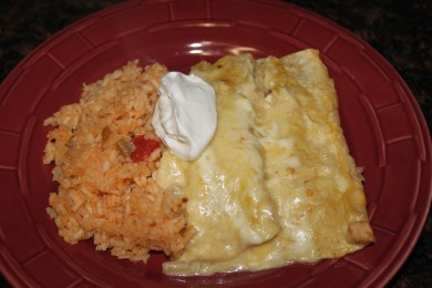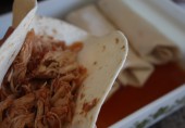 Куриное филе, приготовленное в соусе энчилада, разделенное на волокна и запеченное в кукурузных лепешках с сыром и зеленью.