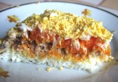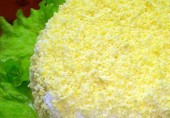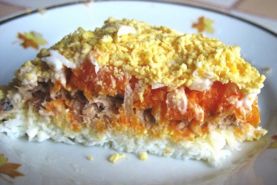 Многослойный салат в форме торта Мимоза - из консервированной рыбы, яиц, чеснока, моркови и майонеза.