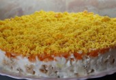 Этот салат называется «Мимозой», так как он очень похож на этот нежный и пушистый цветок весны. Существует множество вариаций на тему рецепта этого салата, некоторые делают с рисом, некоторые с картофелем, некоторые с вареной морковью, иногда добавляют сливочное масло, а иногда делают и без сыра.