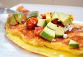 Вкусный и питательный омлет с козьим сыром, печеными помидорами и авокадо.
