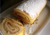 Рулет из бисквитного теста, пропитанного сиропом, с начинкой из вареной сгущенки с грецкими орехами.