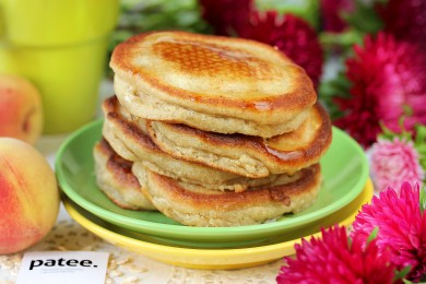 Это рецепт полезных оладушек, потому что в них используются овсяные хлопья и овсяная мука. Постарайтесь найти необработанные цельнозерновые овсяные хлопья, которые нужно варить не менее 5 минут.