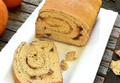 Рулет из тыквенного дрожжевого теста с начинкой из тыквенного пюре с коричневым сахаром и корицей.