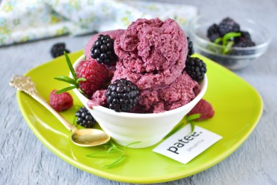 Очень вкусное летнее лакомство, полезное, питательное и освежающее. Замороженный йогурт с ежевикой, бананами и персиками.