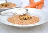 Овсяная каша с морковью, орехами и специями, украшенная грецкими орехами, изюмом и льняным семенем.