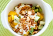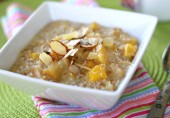 Тропическая версия овсяной каши на кокосовом молоке с манго, яблоком и нектаром агавы. Подавайте, украсив миндалем, кокосовой стружкой или засахаренным имбирем.